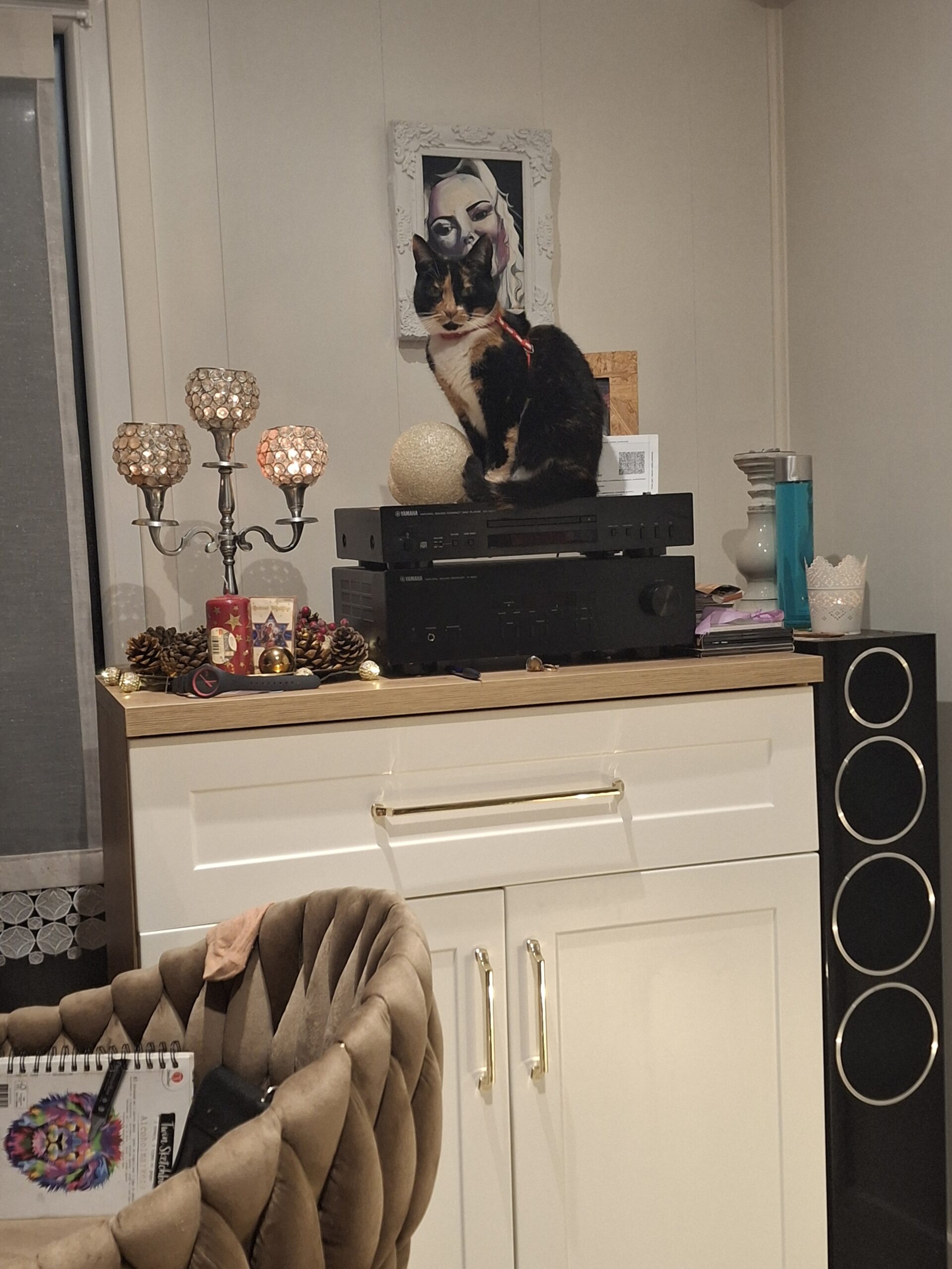 Salon z kuchnią – sprzęt audio, dzieła sztuki Justyny Taszki, piekarnik, toster, fondue, hot-dog maker